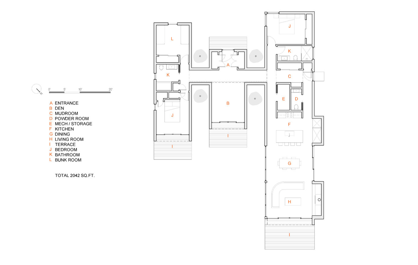 The Cape Breton Retreat is a private residence that showcases both prefabricated construction techniques and a deep appreciation for the natural environment. At the heart of this project lies our clients’ profound desire to spend as much time outside as possible. This concept is realized through the subdivision of the program into five distinct buildings, each carefully nestled within the landscape, that pinwheel around a central gathering space (“the Lodge”). Breaking up the program and creating an extensive network of trails throughout the property encourages movement between the various zones and further fulfills the clients’ wish to seamlessly integrate indoor and outdoor living.